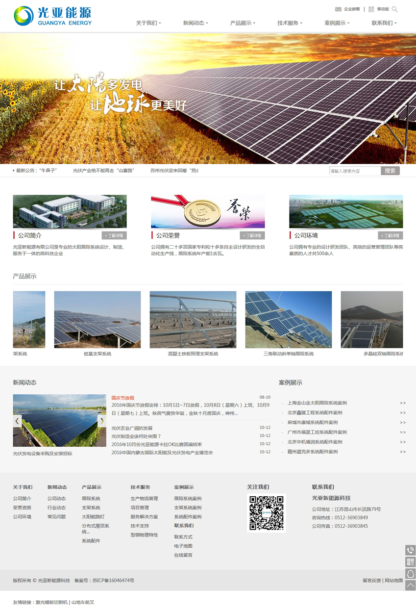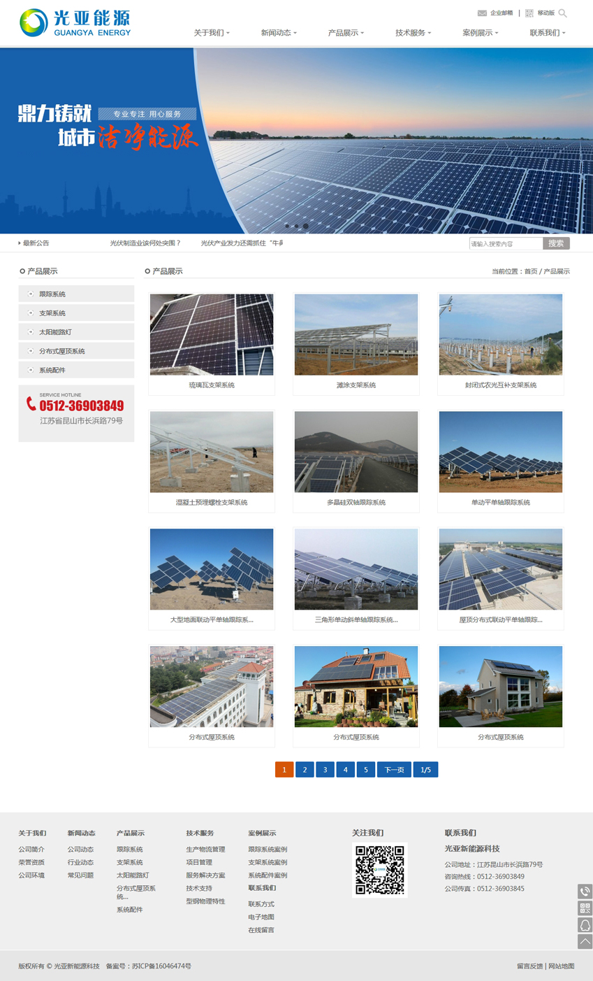 光亞能源科技(昆山)有限公司是專業的太陽跟蹤系統設計、制造、服務于一體的高科技企業,公司始終立足產業前沿,秉持向產品要市場、向研發要未來、向管理要效益的發展理念,積極推動科學技術創新,不斷提升企業核心競爭力,力爭將亞新打造成全球領先的太陽跟蹤系統和光伏固定支架系統集成商及運營商。公司自主設計研發的產品有雙軸跟蹤系統、平單軸跟蹤系統、斜單軸跟蹤系統及光伏固定支架系統,廣泛應用于太陽能大中型地面電站和分布式光伏電站,公司擁有二十多頂國家專利和十多條自主設計研發的全自動化生產線,跟蹤系統年產能1吉瓦。固定支架年產能2吉瓦。