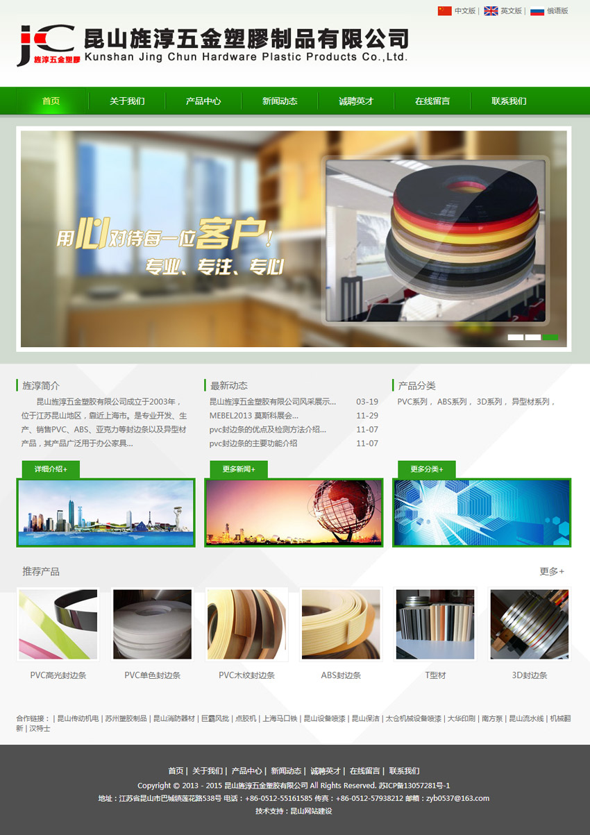 昆山旌淳五金塑膠有限公司成立于2003年,位于江蘇昆山地區,靠近上海市。是專業開發、生產、銷售PVC、ABS、亞克力等封邊條以及異型材產品,其產品廣泛用于辦公家具、櫥柜、教具、室內裝修等領域。隨著技術的不斷提高以及產品樣式的增加,我們的封邊條產品從質量上和價格上都能滿足各類客戶的需求!